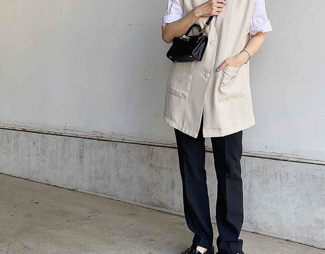 ユニクロ×theory「感動タックイージーパンツ」をYouTuberのn.cocoさんがイチオシ。丈が短めなので、ボリュームあるスニーカーとの相性も◎なのだとか。